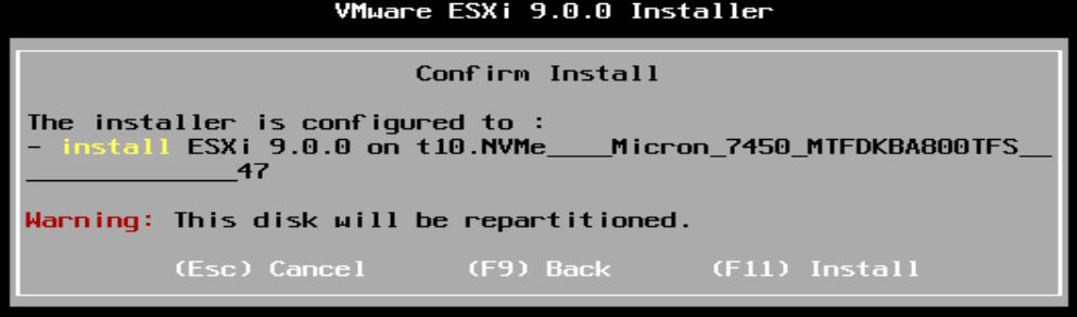 • Press F11 to confirm that you want to install ESXi on the selected disk.