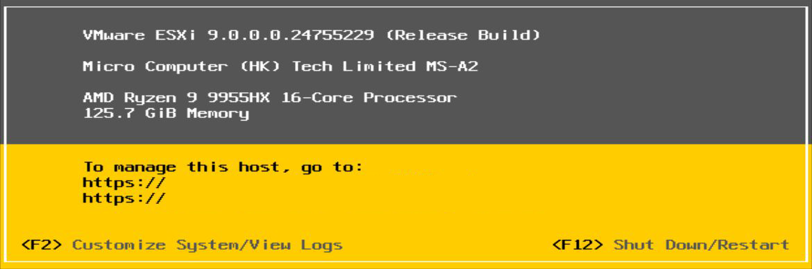 • Once the booting process is completed, you will now see the ESXi direct console interface.