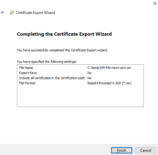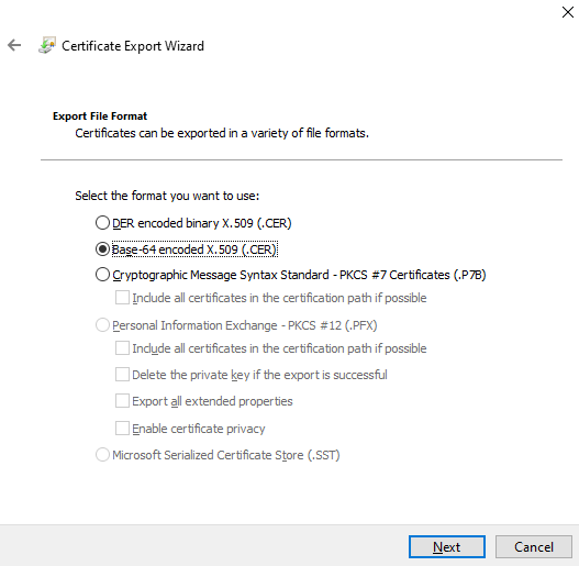 - Select Base-64 encoded X.509 (.CER) and click Next.