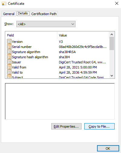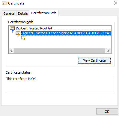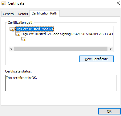 In my example, the next certificate is the intermediate certificate, which is the DigiCert Trusted G4 Code Signing RSA4096 SHA384 2021 CA1 certificate.