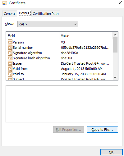 - In the new certificate window, click the Details tab, then click Copy to File.
