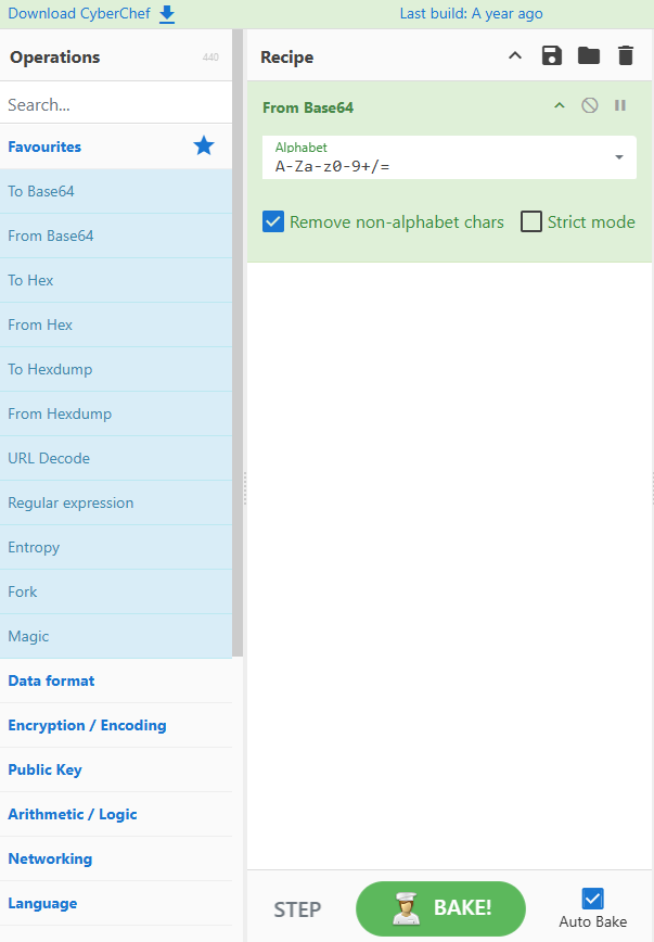 To use CyberChef, you need to bake it. Baking consists of using operations to make a recipe.