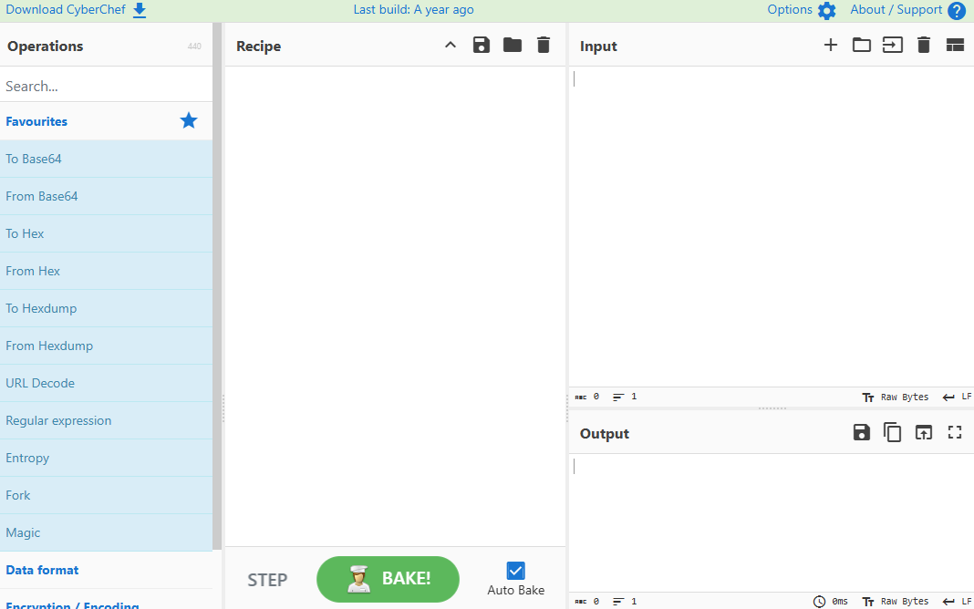 CyberChef is a web application with an abundance of tools, including decoding and encoding to and from various formats such as Base64, ROT13, XOR, and Hex. It is often referred to as the Cyber Swiss Army Knife, and I can see why. There are over 400 tools.
