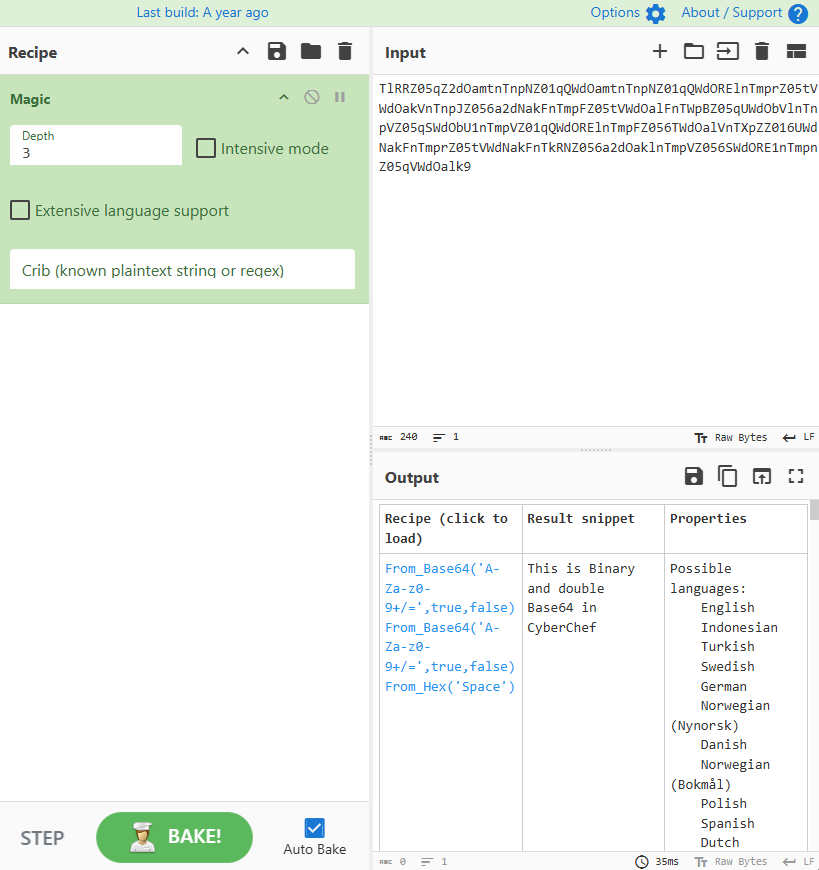 I could use the Magic operation to figure out that it is Hex and double Base64.