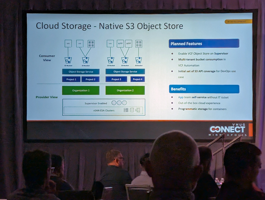 The second day of VMUG Connect was a complete day full of sessions. The first session of the day was the keynote, The Next Era of VCF: Accelerating Your Cloud Journey with VMware Cloud Foundation, hosted by Peter Near. Peter spoke about the future of VCF. Including possible new features coming to VCF, such as S3 storage.
