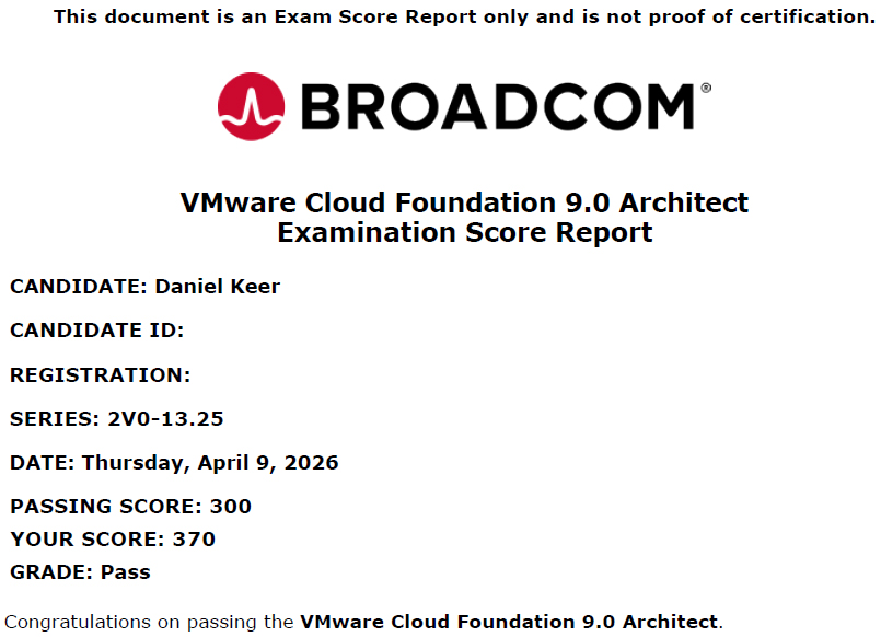 I passed the VCP-VCF 9 Architect exam with a score of 370. I needed 300 to pass. I am now a VMware Certified Professional – VMware Cloud Foundation Architect.